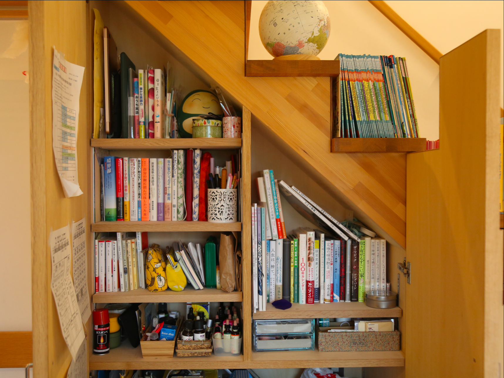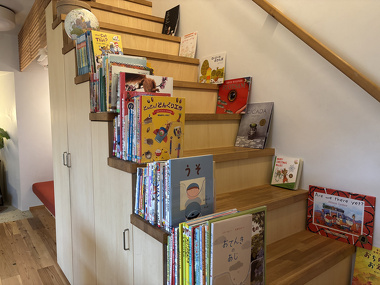 ・階段に腰掛けて読書:お子さんが階段に座って本を読める、図書館のような居場所にもなっています。これも「兼ねる」ですね!
