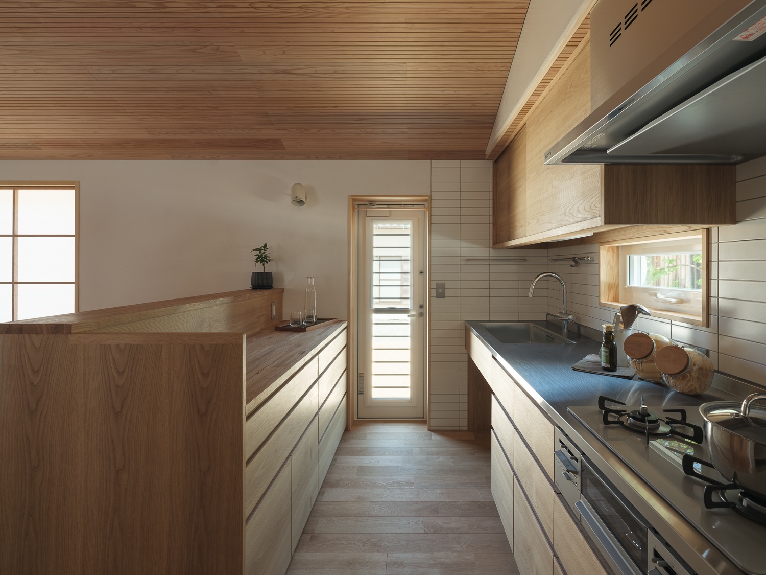 造り付けの作業台や吊り収納など、収納スペースをたっぷり設けたキッチン。勝手口からは北庭に出られる。