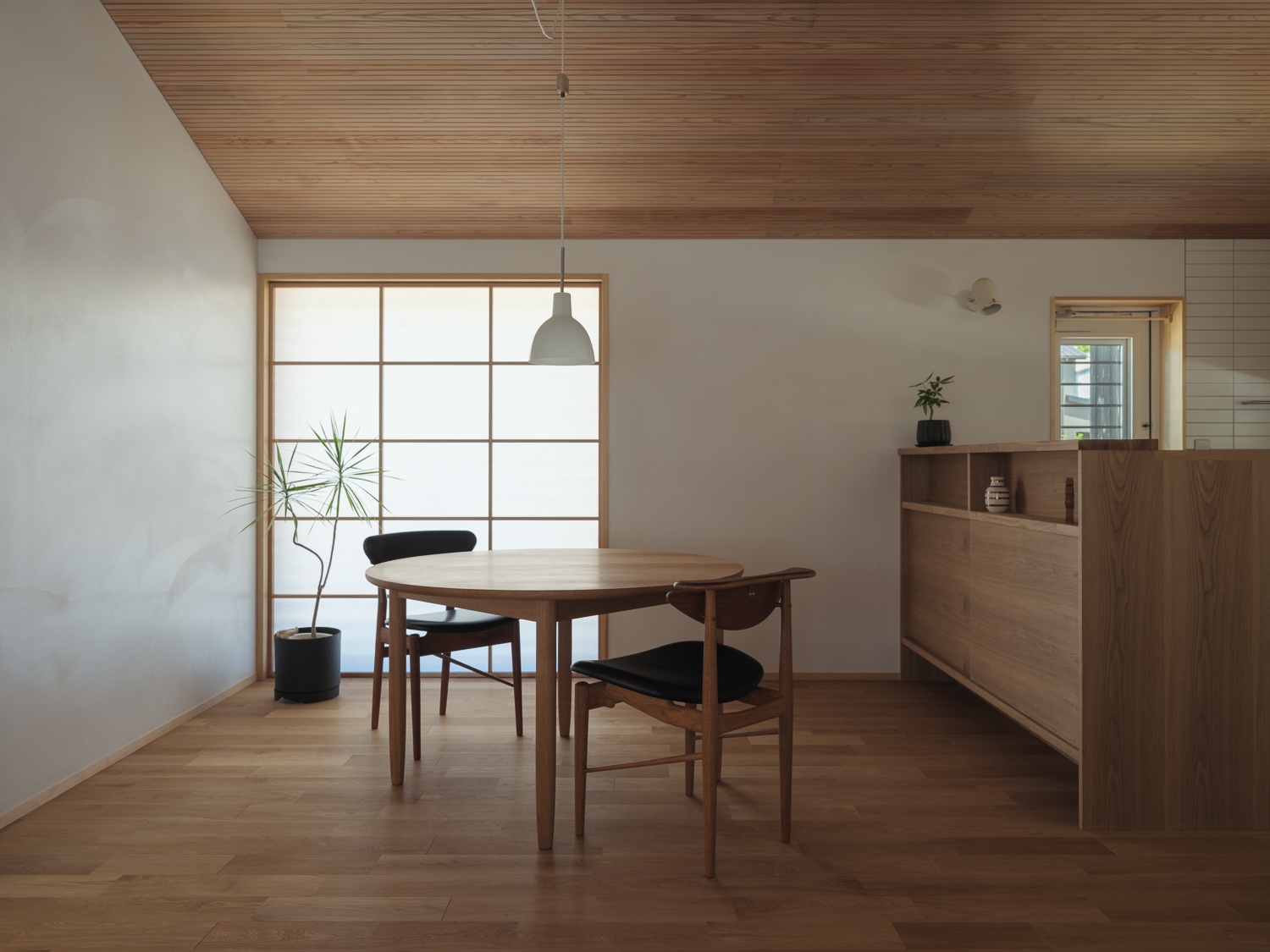 勾配天井のダイニング。光と風が通り抜ける開放感あふれる場所に。