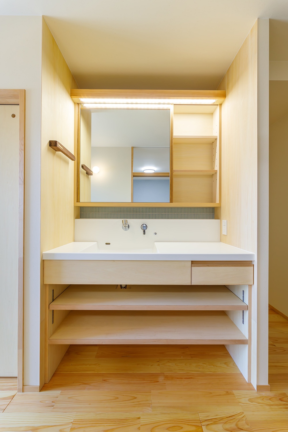 洗面台はシームレスでお掃除がしやすい天板。鏡は可動式で、使う人に合わせて移動できる。