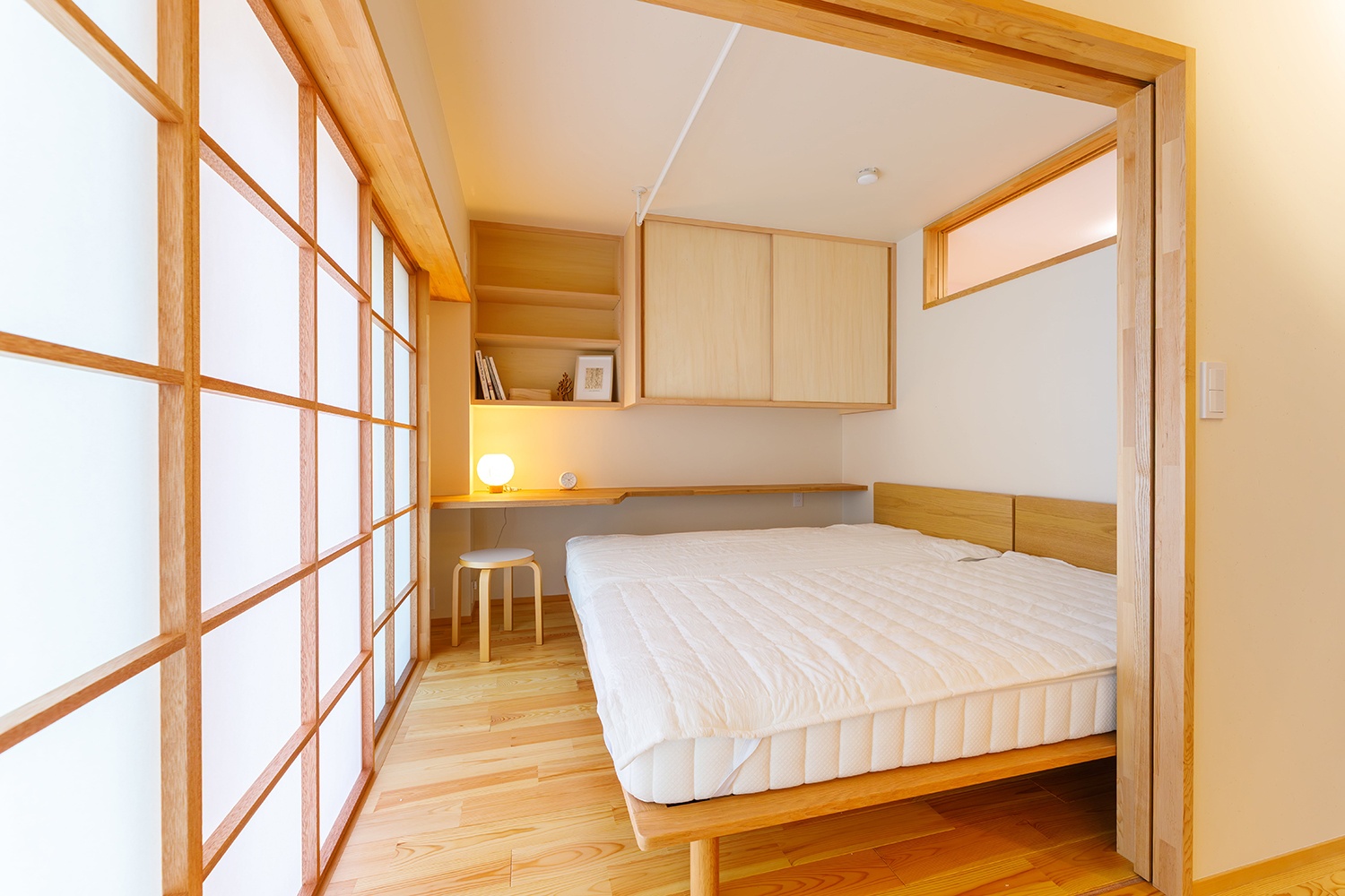 リビングから続く4.5帖の寝室。リモートワークで使えるカウンターも設けた。