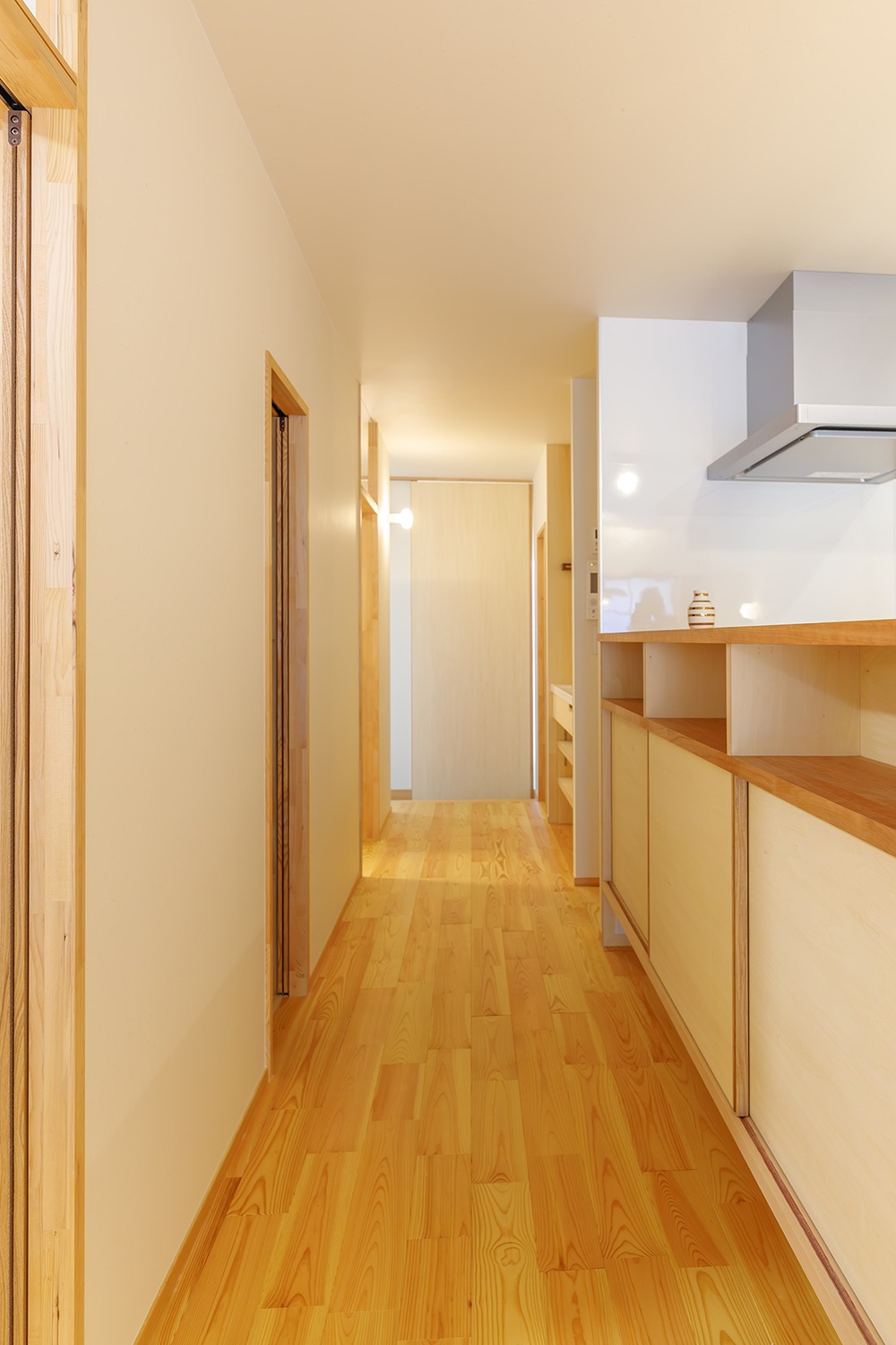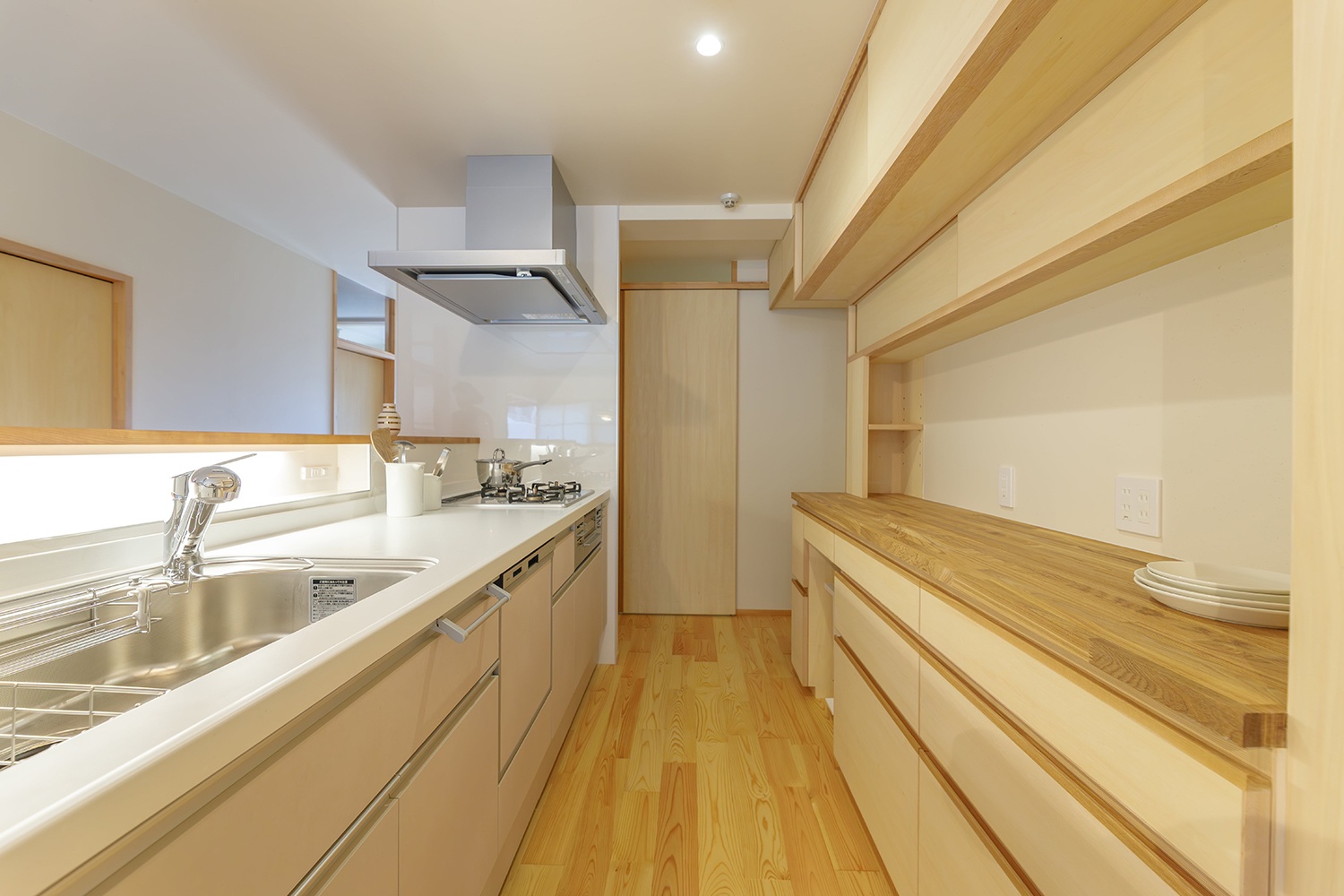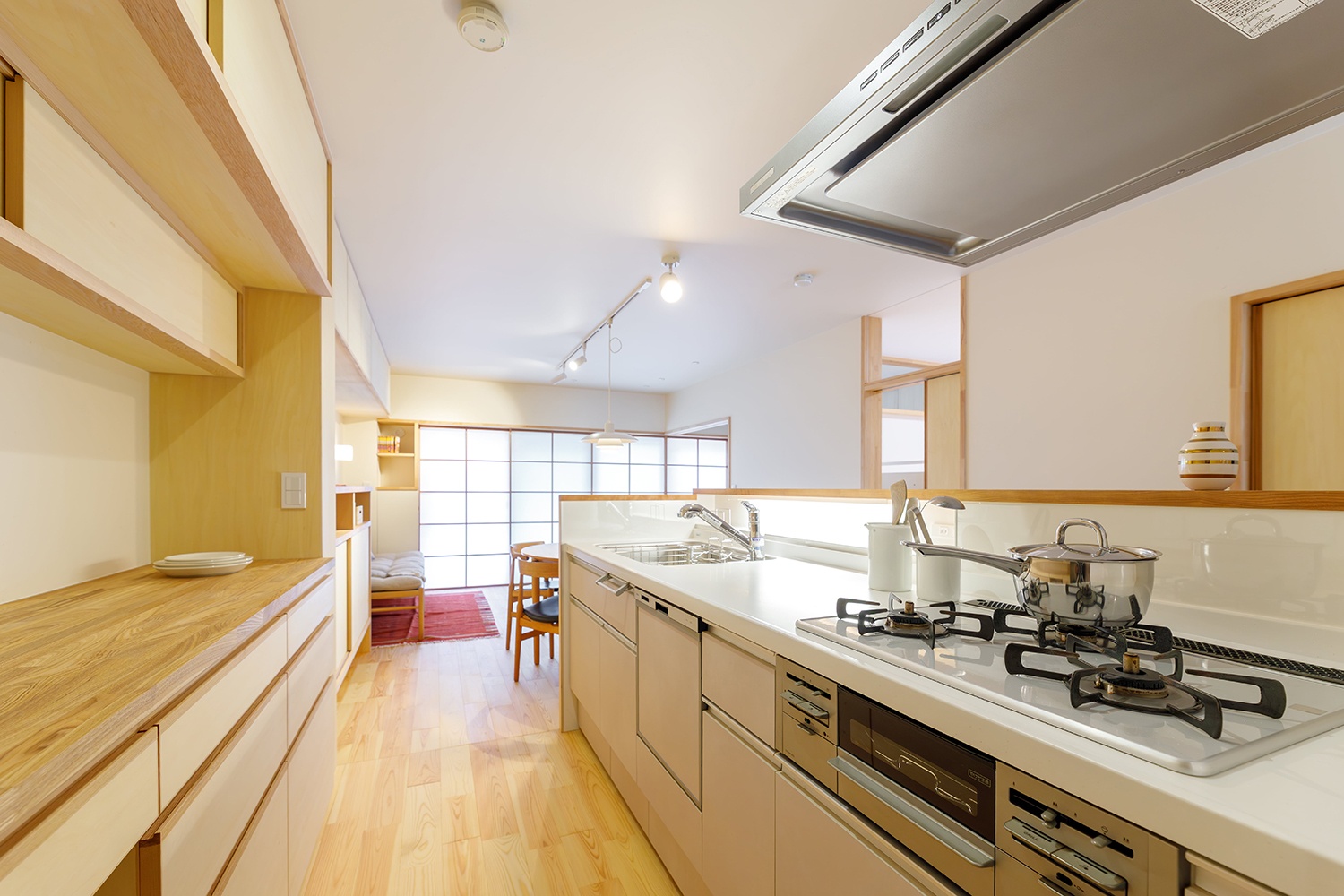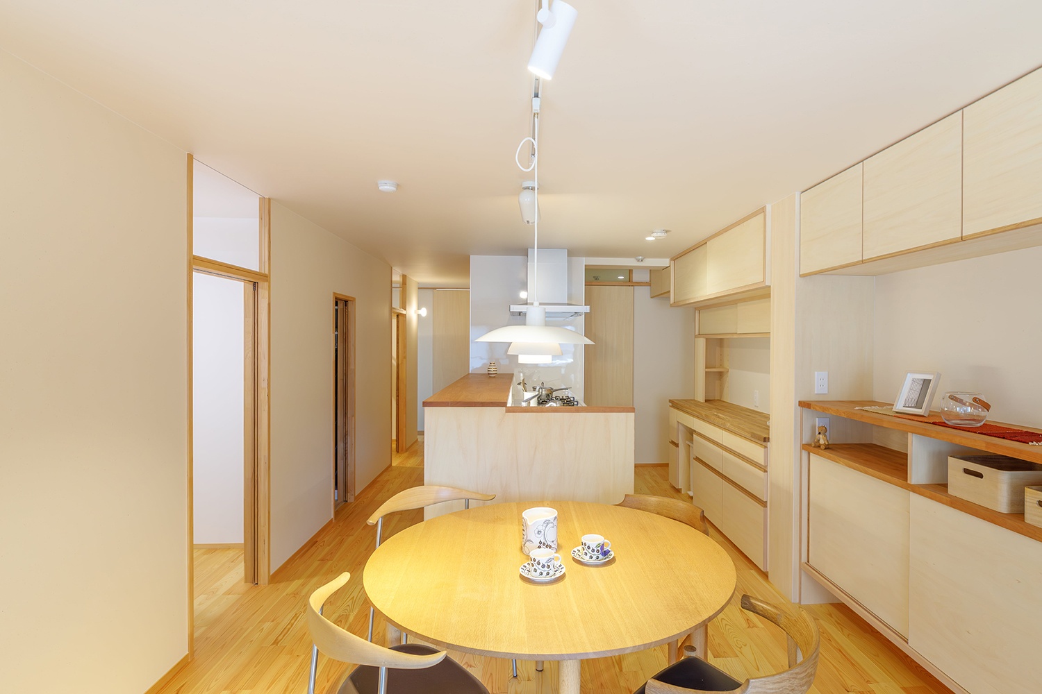 キッチンは向きを変え、脱衣室まで一直線の動線を確保。配膳や片付けがスムーズに。