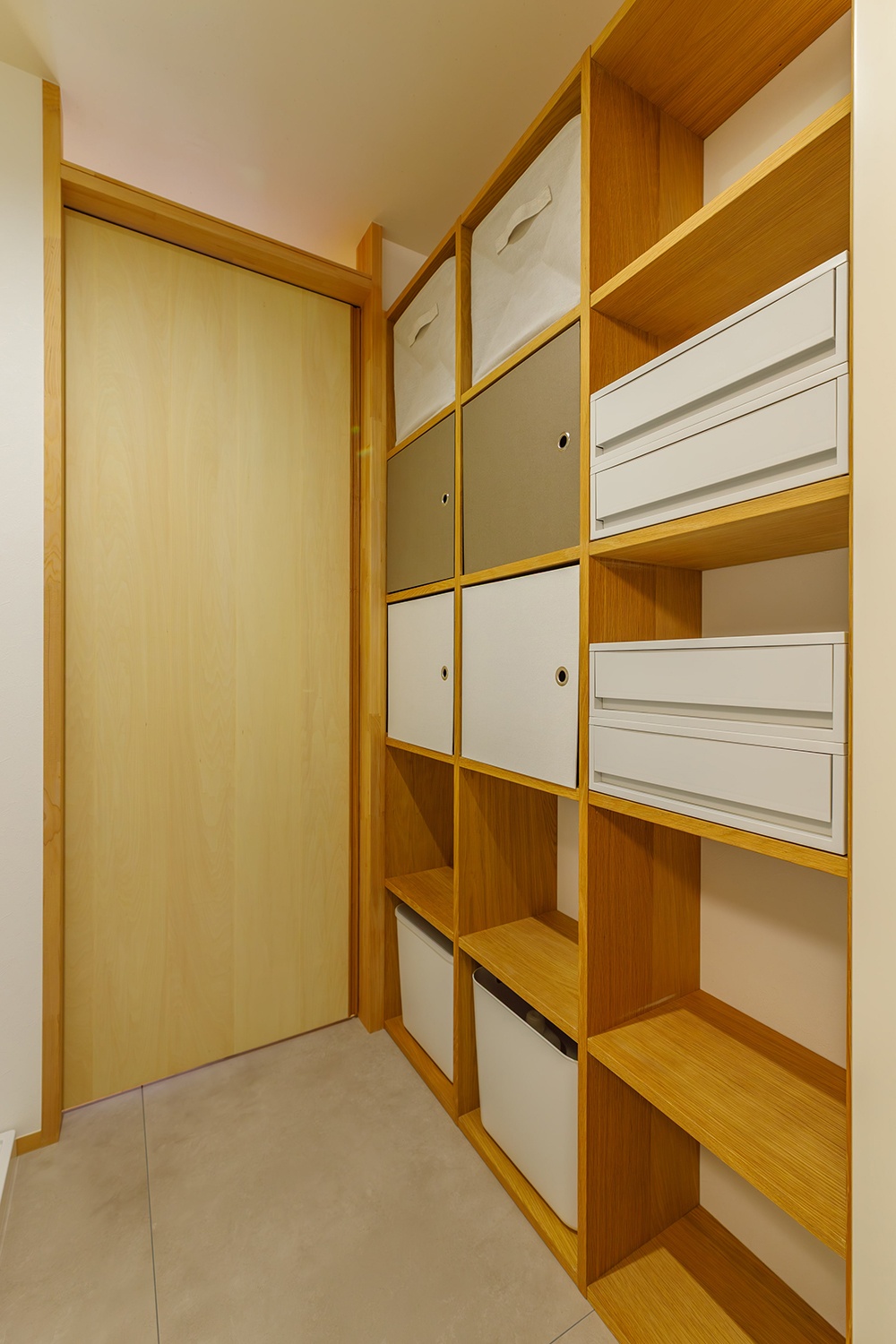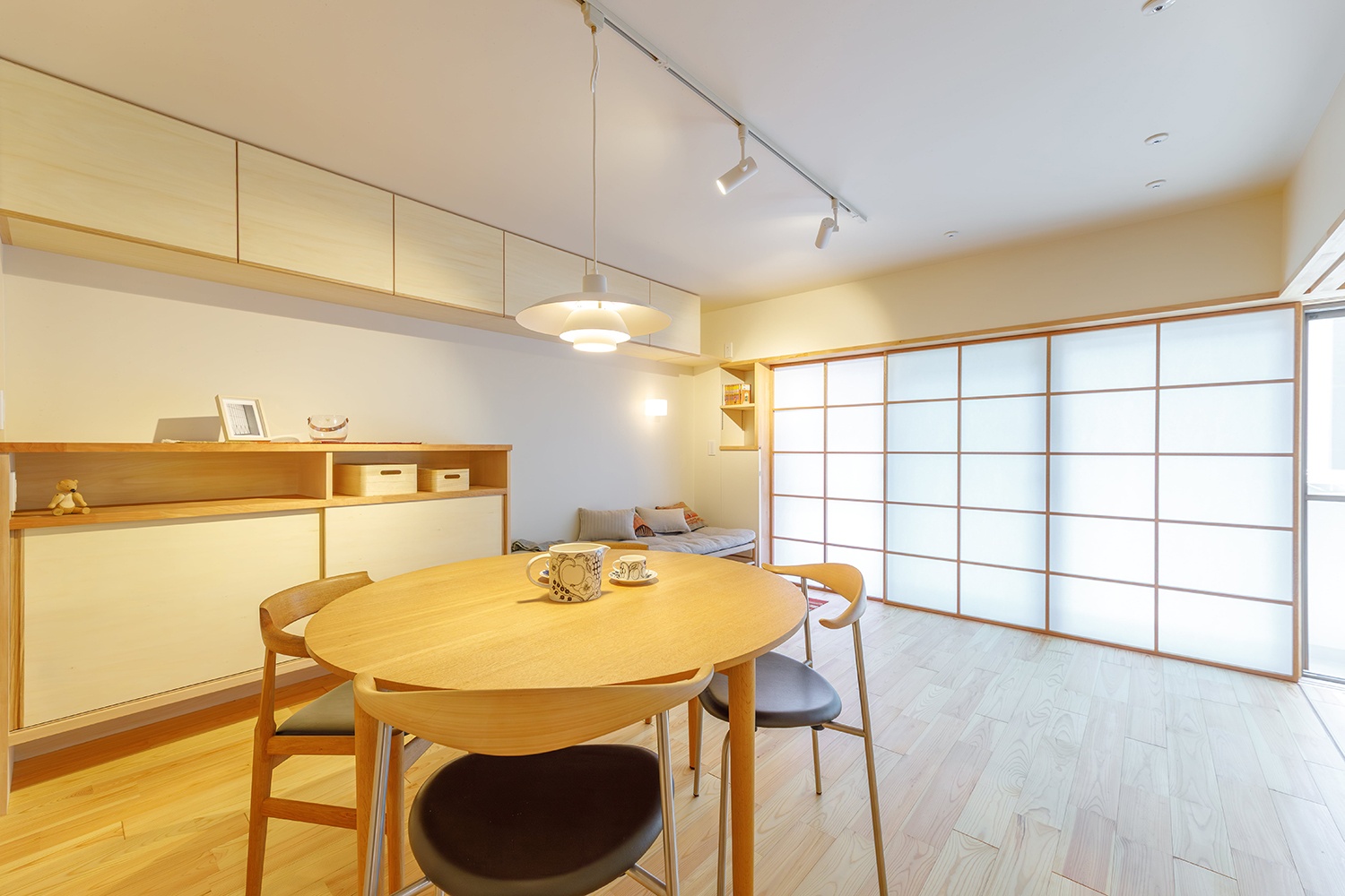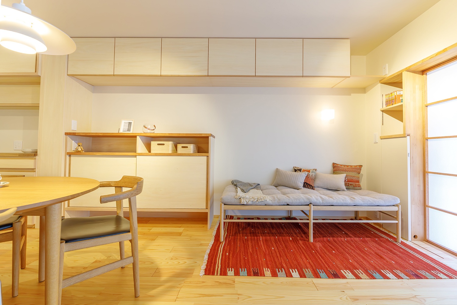 リビングは南向きの窓から優しい光が障子を通して入ってくる。 上にも全面扉付きの収納スペースを確保。
