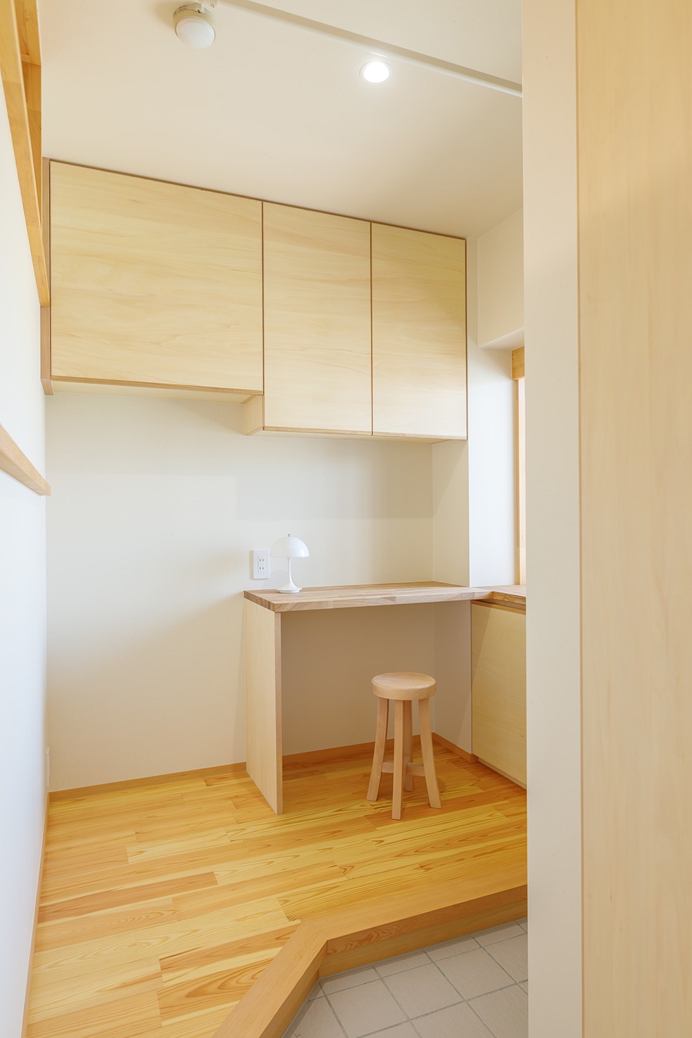 ダイニングの横には、季節の飾りや書類、お子様の作品など、お施主様の持ち物に合わせて奥行きを調整した造作家具を設けた。
