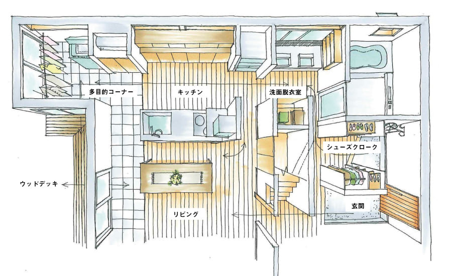 洗濯物を洗う→干す→仕舞うが一連の動作で行える、一直線の家事動線。 家族6人が使う水まわりは行き止まりなく、スムーズに移動できます。